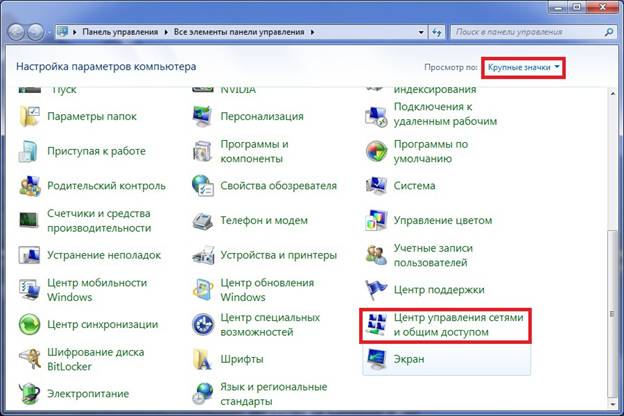 3.В меню "Просмотр по:" выбираем "Крупные значки". Заходим в "Центр управления сетями и общим доступом"