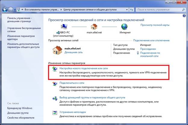 4. Выбираем пункт "Настройка нового подключения или сети"