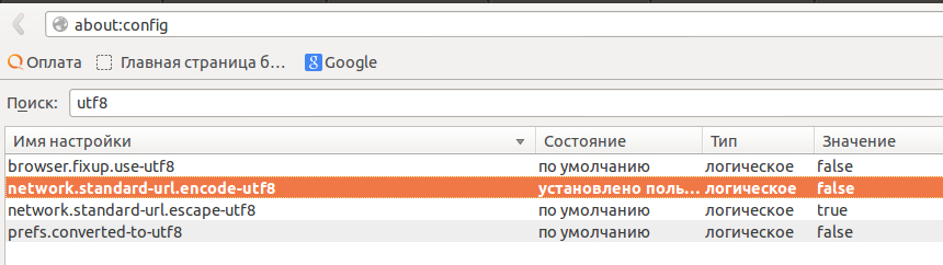 • Находим параметр network.standard-url.encode-utf8 и меняем его значение на «false»