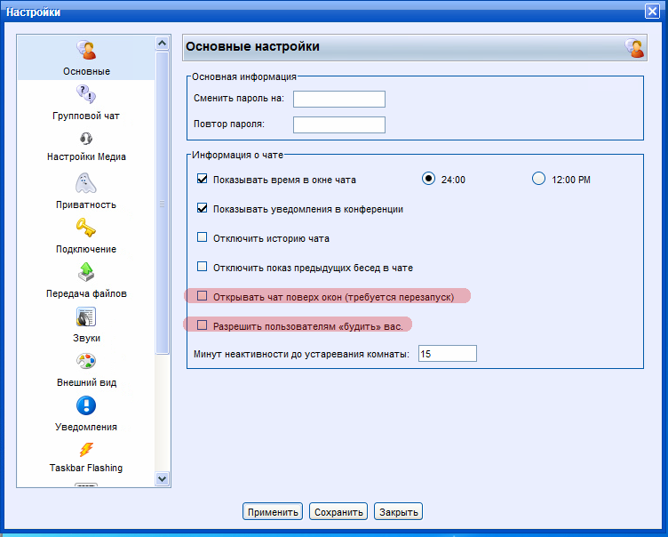 5. Уберем "поверх всех окон" и возможность прерывать нас при приходе сообщения. Пункт "Основные"